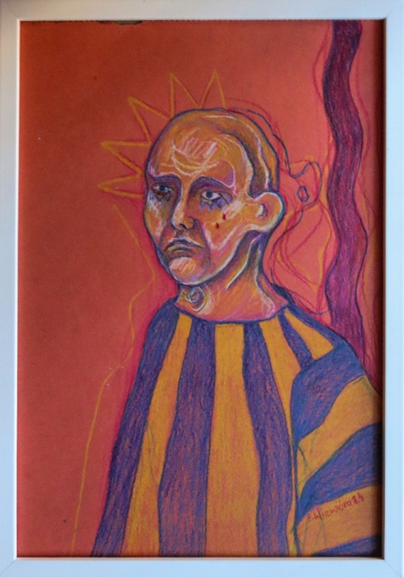 ekspresyjny portret w intensywnych barwach pomarańczy i fioletu. Balansuje na granicy smutku i zadumy.